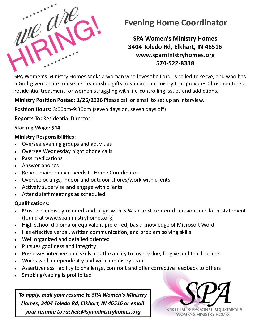 SPA Women’s Ministry Homes (Elkhart, IN) seeks a woman who loves the Lord, is called to serve, and who has a God-given desire to use her leadership gifts to support a ministry that provides Christ-centered, residential treatment for women struggling with life-controlling issues and addictions.