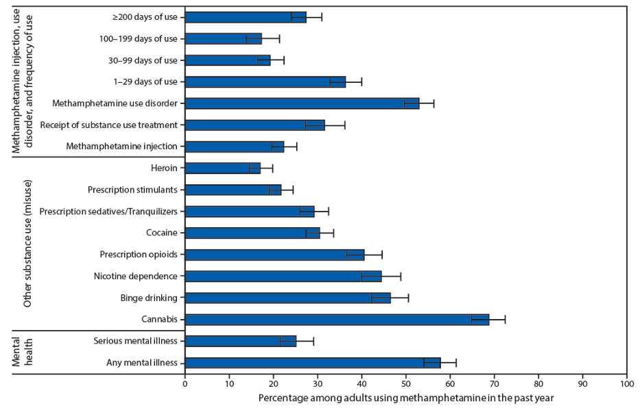 Due to these risks, secular experts agree that methamphetamine use poses a severe problem for more than fourteen million American adults throughout their lives. Most secular sources consider methamphetamine and other drug addictions to be a psychological disorder. The changes in the brain due to the dopamine levels reinforce addiction behavior, and secular psychologists and healthcare professionals would say that these neurological changes are evidence of substance abuse disorder. Meth use is also correlated with other substance use disorders – abusing other drugs – and severe mental health issues. The graph below, from the CDC’s website, shows the concordance rate of other issues among American adults who report past-year methamphetamine use. Many health experts cite the lack of a drug to treat this addiction as a major barrier to helping the addicted.